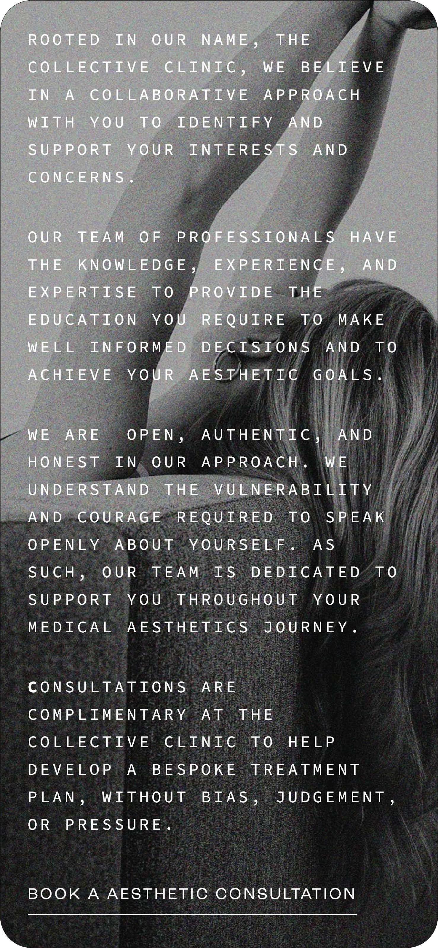 The Collective Clinic believes in tailoring an experience to help one’s journey in feeling and looking their best at any age, free from society’s standards of beauty.